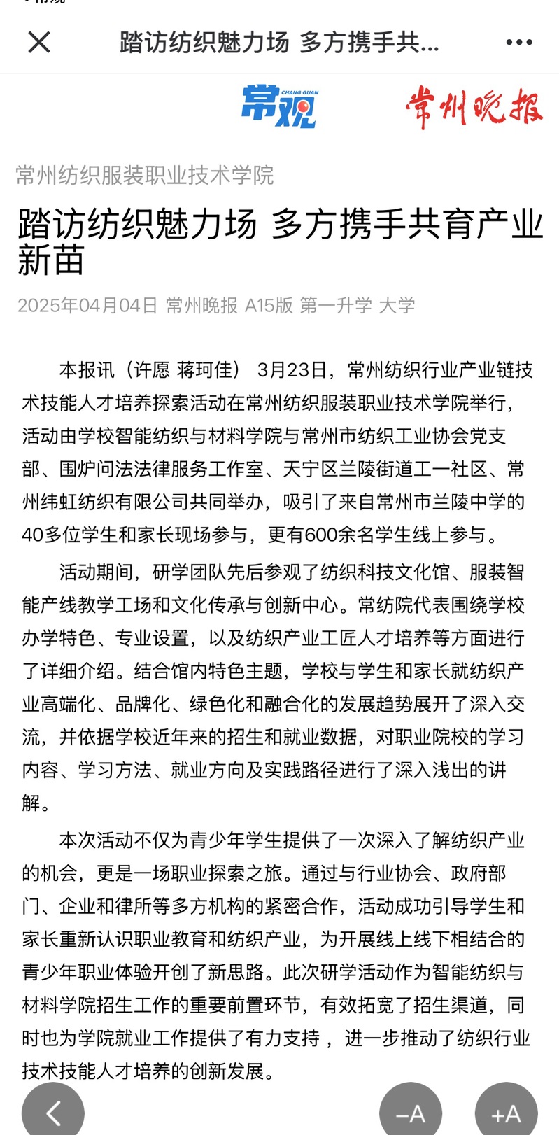 學(xué)雷鋒、做志愿、服務(wù)改革建新功——我校開展學(xué)雷鋒志愿服務(wù)月活動2025-04-07為深入貫徹落實習(xí)近平總書記關(guān)于弘揚雷鋒精神的重要論述,深刻把握雷鋒精神的時代內(nèi)涵,引領(lǐng)常紡青年在志愿服務(wù)實踐中大力弘揚“奉獻、友愛、互助、進步”的志愿服務(wù)精神,今年3月,以“學(xué)雷鋒、做志愿、服務(wù)改革建新功”為主題,系統(tǒng)部署開展2025年“學(xué)雷鋒”志愿活動月專項活動。通過組織全校師生開展30余場主題鮮明、形...省委第十巡視組巡視常州紡織服裝職業(yè)技術(shù)學(xué)院黨委工作動員會召開2025-04-04根據(jù)省委關(guān)于巡視工作的統(tǒng)一部署,2025年4月2日,省委第十巡視組巡視常州紡織服裝職業(yè)技術(shù)學(xué)院黨委工作動員會召開。省委第十巡視組組長李圣華作了動員講話,對深入學(xué)習(xí)貫徹習(xí)近平總書記關(guān)于巡視工作的重要論述、關(guān)于教育的重要論述和對江蘇工作的重要講話精神,認真貫徹落實全省巡視巡察工作會議暨對村巡察工作推進會、省委...